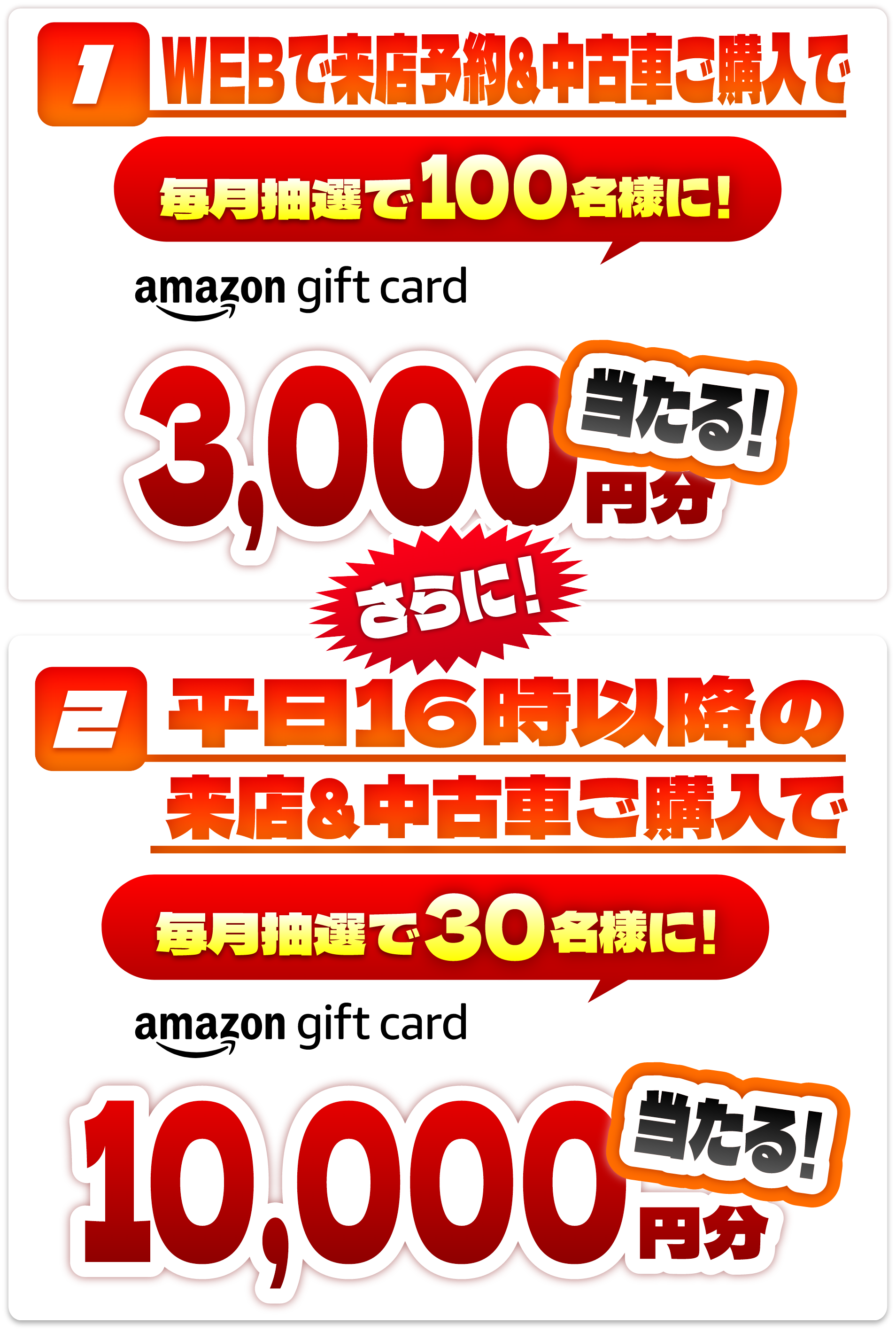 ※当選者様にはAmazonギフトカードのコードをEメールでの送信をもって発表と代えさせていただきます。ご本人様が特定できない場合は対象外です。※受信拒否設定等の理由によりお受け取り頂けなかった場合の再送信は致しかねます。※当選本数:①ネクステージグループ対象店舗へ当月中にご来店の上、中古車ご成約いただいた方の中から抽選で100名様。②ネクステージグループ対象店舗で平日夕方16時以降にご来店の上、中古車ご成約頂いた方の中から抽選で30名様。※本キャンペーンは予告なく変更・終了となる場合があります。※本キャンペーンは株式会社ネクステージによる提供です。本キャンペーンについてのお問い合わせはAmazonではお受けしておりません。株式会社ネクステージまでお願い致します。※Amazon、Amazon.co.jpおよびそれらのロゴはAmazon.com, Inc.またはその関連会社の商標です。